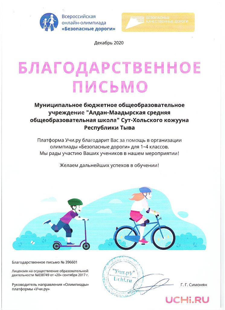 Главная МБОУ Алдан-Маадырская СОШ приняли участие в Всероссийской онлайн-олимпиада «Безопасные дороги» для учащихся 1-4 классов и получили благодарственное письмо. 26.11.2021 /